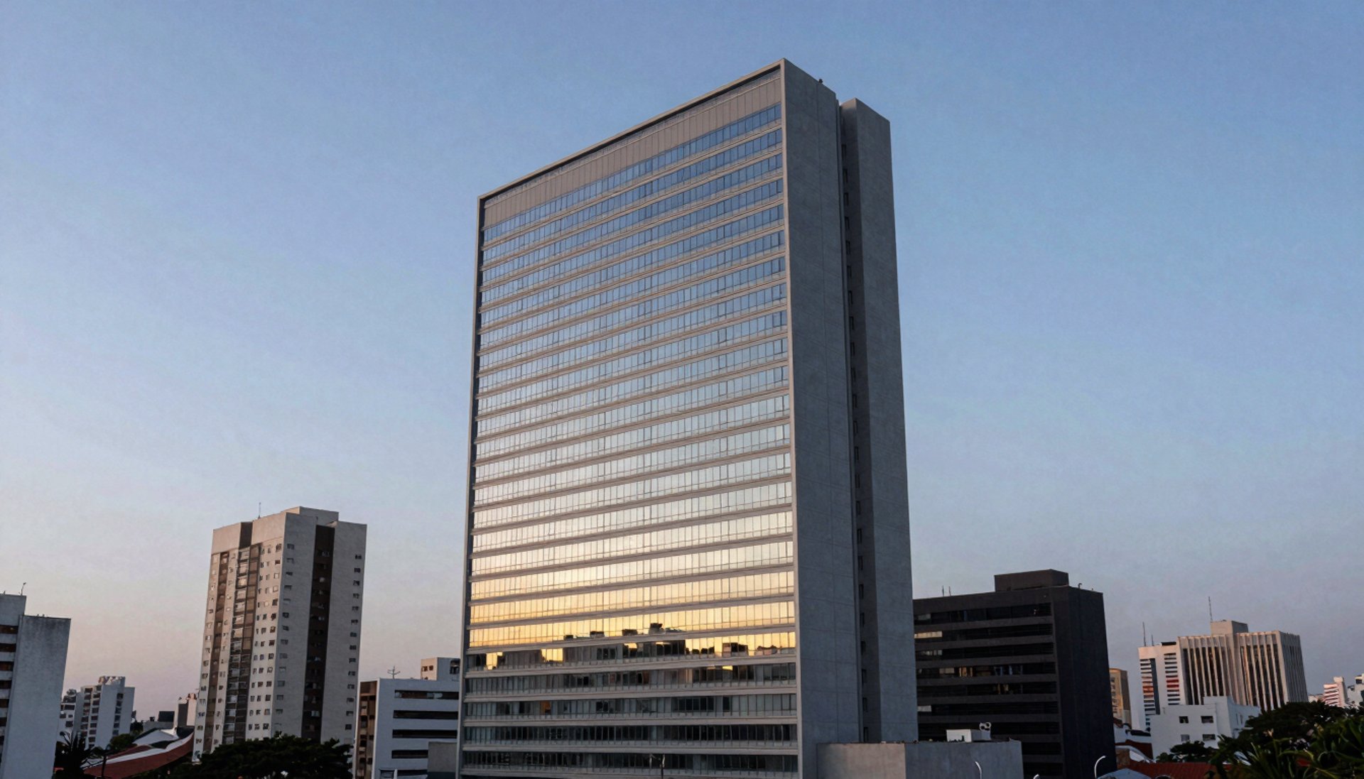 A professional desk with a notebook and a calculator in a clean South American / Brazilian office, representing precision.